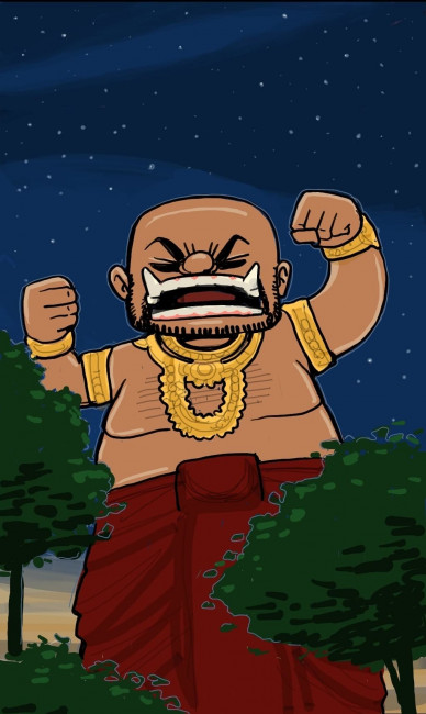 โดยที่ภีมะไม่รู้เลยว่าได้เข้าสู่พื้นที่ป่าที่ชื่อว่า "หิทิมพวนา" ซึ่งเป็นขอบเขตที่อยู่อาศัยของพวกรากษส (ยักษ์) โดยมีรากษสผู้นำชื่อว่า "หิทิมพะ"