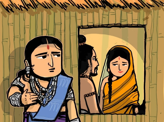เมื่อเจ้าชายธฤษฏะทยุมันเข้าไปแอบฟังสิ่งที่คนในบ้านพูดกัน แทนที่จะเป็นเรื่องที่พราหมณ์ปกติพูดคุยกัน กลับเป็นเรื่องของอาวุธหรือวิชาการปกครอง ซึ่งไม่ใช่เรื่องปกติที่พราหมณ์จะพูดกัน