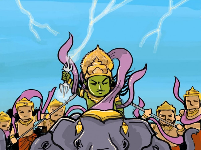 อรชุนเมื่อต้องเผชิญหน้ากับพระอินทร์ผู้เป็นบิดา ถึงกับหน้าเสีย และไม่รู้จะทำอย่างไรดี แต่ดูจากท่าทีเอาจริงเอาจังของพระอินทร์แล้ว คาดว่าจะไม่มีการอ่อนข้อให้ทั้งสองคนเป็นแน่