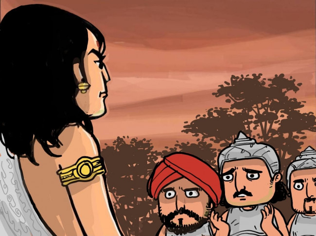 กองทัพนาคนำโดยตักษกะนาคราช คู่แค้นของอรชุน ต้อนวัวไปได้ไม่ไกล พวกตนจึงรีบเร่งเดินทางมาบอกอรชุน เพื่อหวังว่าอรชุนจะติดตามไปนำวัวกลับมา