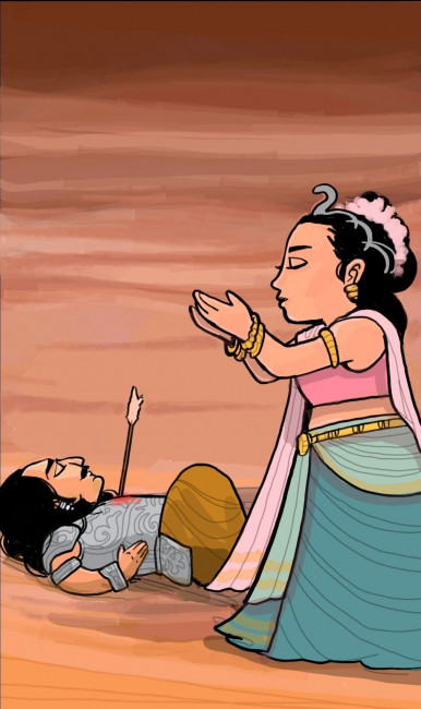 อุลูปีรู้ด้วยญาณว่าวันหนึ่งอรชุนจะต้องตายเพราะสู้รบกับลูกของตนเองที่ชื่อ "พภรุวาหนะ" ซึ่งเป็นลูกของอรชุนที่เกิดจาก "พระนางจิตรางคทา" จึงเดินทางไปเพื่อชุบชีวิตอรชุนกลับมา
