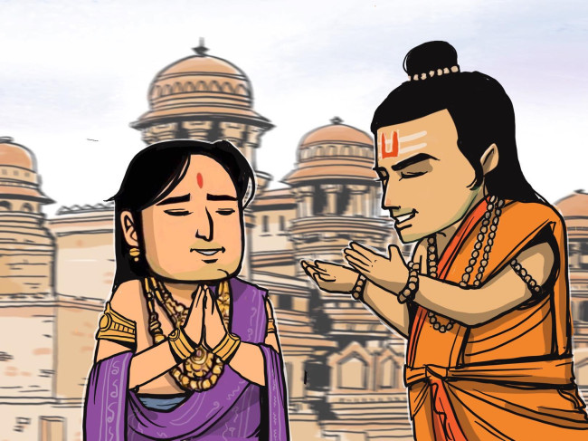 ฤาษีนารทพึงพอใจกับการพาเที่ยวชมสถานที่ต่างๆ ของยุธิษเฐียรเป็นอย่างมาก เมื่อจบการเยี่ยมชม ทั้งสองก็นั่งพักที่ท้องพระโรงในพระมหาราชวัง ยุธิษเฐียรไถ่ถามถึงการเดินทางของฤาษีนารท ว่าการเดินทางของท่านเป็นอย่างไรบ้าง ได้ยินว่าท่านได้เดินทางไปยังสามโลก ทั้งสวรรค์ บาดาล และโลกมนุษย์