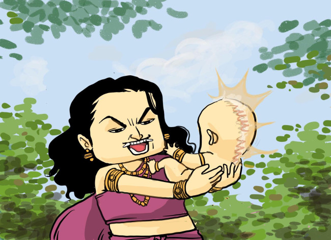 นางยักษ์จาราได้กลิ่นของมนุษย์มาแต่ไกล จึงเดินตามกลิ่นมาได้พบกับพระโอรสของท้าวพฤหัสรถ ที่ถูกทิ้งไว้ใต้ต้นไม้ ร่างกายแยกออกเป็นสองซีกอย่างน่าเวทนา นางยักษ์ดีใจเป็นอย่างมากเพราะเป็นโอกาสที่จะได้กินเนื้อมนุษย์ที่ยังเป็นๆ นางจึงได้หยิบพระโอรสที่แยกออกเป็นสองชิ้นขึ้นมา แล้วนำมาประกบกันเพื่อให้สะดวกในการนำพากลับไปยังที่พัก