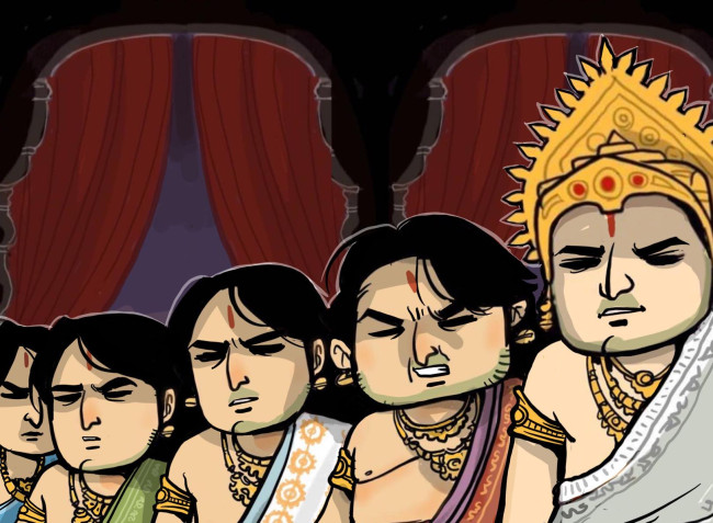 ส่วนยุธิษเฐียรผู้เป็นต้นเหตุของการสูญเสียครั้งนี้กลับนั่งก้มหน้าก้มตาสงบนิ่ง ไม่พูดอะไรสักคำเดียว ในทางตรงกันข้าม ทุรโยธน์และศกุนิผู้ได้ครอบครองสมบัติทั้งหมด กลับหัวเราะอย่างพอใจด้วยเสียงอันดังลั่นท้องพระโรง จึงกลายเป็นสถานการณ์ที่เลวร้ายที่เกิดขึ้นในท้องพระโรงแห่งหัสตินาปุระ จนผู้เข้าร่วมชมการละเล่นอดนึกเสียใจไม่ได้ที่มันเลยเถิดมาถึงขั้นนี้ แต่ก็ไม่มีผู้ใดปริปากออกมาแม้แต่คำเดียว