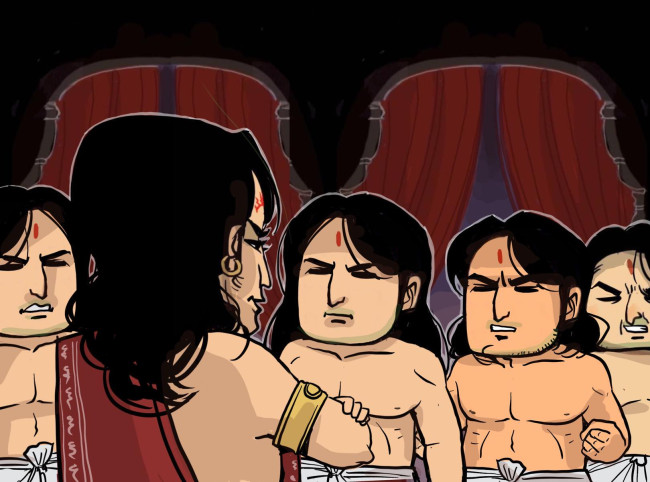 ทางฝ่ายทุรโยธน์ ศกุนิ และราธียะ ผู้พยายามอย่างยิ่งที่จะทำลายพี่น้องปาณฑพให้สิ้นซาก และดำเนินการตามแผนมาได้จบเกือบถึงจุดสิ้นสุดแล้ว ต้องมาเจอการแทรกแซงของท้าวธฤตราษฏร์ สร้างความหัวเสียให้กับทุรโยธน์เป็นอย่างมาก แต่ก็ไม่สามารถจะทำอะไรได้อีก จนต้องเดินออกจากท้องพระโรงไป โดยมีศกุนิเดินตามออกไปติดๆ