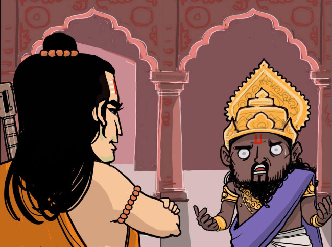 ฤาษีนารถผู้เดินทางไปทั่วทุกดินแดน ก็ปรากฏตัวขึ้นต่อหน้าท้าวธฤตราษฏร์ ฤาษีนารถทราบดีถึงความในใจของท้าวธฤตราษฏร์ หลังจากรับการต้อนรับจากท้าวธฤตราษฏร์แล้ว ฤาษีนารทกล่าวกับท้าวธฤตราษฏร์ว่า "ในช่วง 14 ปีนี้ เจ้าและลูกหลานของเจ้า ได้เสพย์สุขจากความอยุติธรรม ของพี่น้องปาณฑพ จะได้ครอบครองทรัพย์สิน ปวงประชาจะมีความสุข บ้านเมืองร่มเย็น"