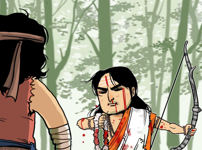 การต่อสู้ระหว่างอรชุนกับพรานป่านิรนาม ดำเนินไปอย่างยาวนาน จะเรียกว่าการต่อสู้ก็ไม่เหมือนการต่อสู้เสียทีเดียว เนื่องจากผู้ได้รับบาดเจ็บมีเพียงแต่อรชุนเท่านั้น ไม่ว่าอรชุนจะใช้วิชาอันใด ก็ไม่สามารถทำอันตรายพรานป่า แม้แต่สักริ้วรอยเดียว ทำเอาอรชุนสับสนในจิตใจไปหมด เฝ้าหาสาเหตุว่ามันเกิดเหตุการณ์เช่นนี้ได้อย่างไร