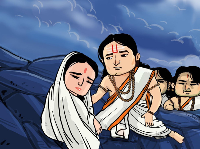 แต่เมื่อเดินทางไปได้สักพัก พระนางเทราปทีที่อดทนเดินทางก็เป็นลมสลบไป พี่น้องปาณฑพทั้งหลายรีบเข้าไปดูแลพระนาง โดยเฉพาะยุธิษเฐียรได้เข้าไปอุ้มพระนาง ยุธิษเฐียรเอ่ยปากขอโทษพระนางเทราปทีในสิ่งที่เกิดขึ้นทั้งหมด และขออภัยที่ตนเองเป็นต้นเหตุของเรื่องราวอันแสนอัปยศซึ่งนำพาให้พระนางต้องมาลำบากตรากตรำอยู่ตอนนี้