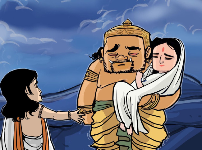 ยุธิษเฐียรขอให้ฆโฏตกัจช่วยอุ้มพระนางเทราปทีเพื่อให้เดินทางต่อไปได้ ฆโฏตกัจเห็นดังนั้นก็เข้าไปอุ้มพระนางเทราปทีอย่างแผ่วเบา อีกทั้งเรียกบริวารของตนเองให้อุ้มพี่น้องปาณฑพทุกคนที่เหลืออีกด้วย ส่วนพราหมณ์เธามยะ และฤาษีโลมสาสามารถเดินทางต่อไปได้โดยไม่ต้องการให้ช่วยเหลือแต่อย่างใด