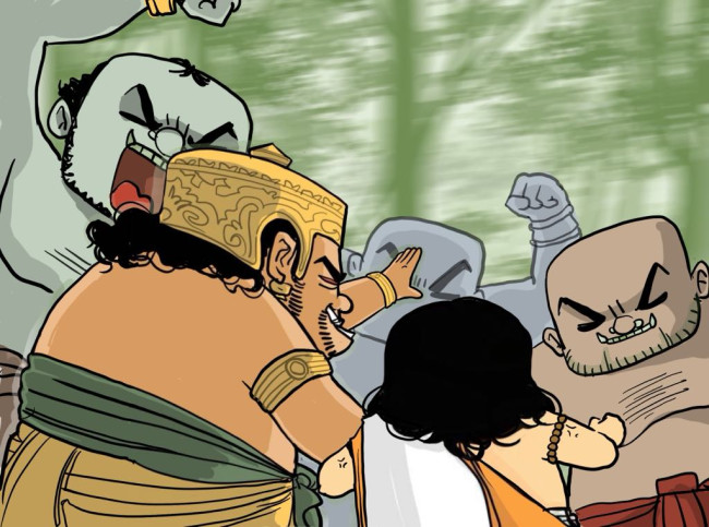 ระหว่างที่ภีมะกำลังต่อสู้กับเหล่ารากษสที่เฝ้าอุทยานของท้าวกุเวรนั้นเอง ยุธิษเฐียรพร้อมทั้งฆโฏตกัจลูกชายของภีมะก็ปรากฏตัวขึ้น ทั้งสองเห็นการสู้รบแล้วตกใจมากจึงรีบเดินเข้าไปห้ามปรามภีมะไม่ให้เข่นฆ่าไปมากกว่านี้