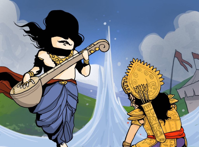 ทุรโยธน์ได้ฟังดังนั้นก็ประกาศว่าดินแดนทั้งหมดในขอบเขตนี้เป็นของตน ตนมีสิทธิ์ครอบครองและไม่จำเป็นต้องขออนุญาตผู้ใด มหาดเล็กนำข้อความจากทุรโยธน์ไปแจ้งต่อเจ้าของสระ