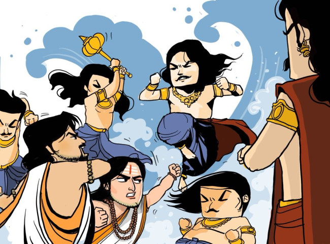อรชุนและภีมะเร่งรีบเดินทางออกจากที่พำนักเพื่อไล่ตามกองทัพคนธรรพ์ที่จับตัวทุรโยธน์ไป แม้ว่าทั้งสองต่างมีความสุขอยู่ในใจที่ทุรโยธน์ได้รับความลำบากเสียบ้าง แต่เมื่อเป็นคำสั่งของยุธิษเฐียร อรชุนและภีมะก็พร้อมจะทำตาม