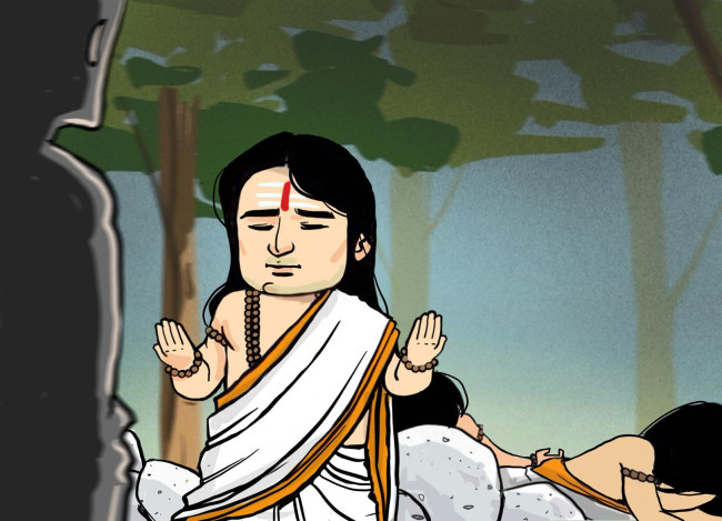 เงาร่างนิรนามจึงเริ่มถามคำถาม เกี่ยวกับจริยธรรม การปกครอง และแม้กระทั่งข้อความในคัมภีร์ต่างๆ ทั้งสองถามตอบกันอย่างต่อเนื่อง ไม่ว่าคำถามของเงาร่างนิรนามจะยากเพียงใด ยุธิษเฐียรก็ตอบได้ทันที และยังตอบด้วยท่าทีอ่อนน้อม สร้างความพึงพอใจให้กับเงาร่างนิรนามเป็นอย่างยิ่ง