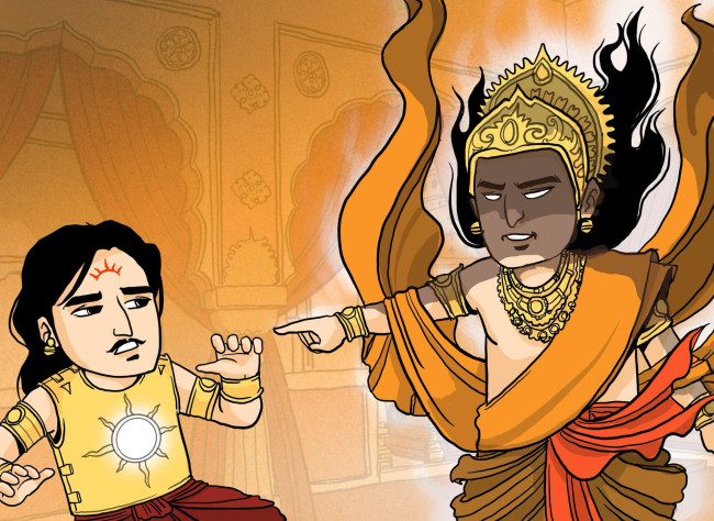 เทพลึกลับยังบอกอีกว่า แท้จริงแล้วพราหมณ์เฒ่านั้นคือ พระอินทร์ ปลอมตัวลงมาเพื่อบั่นทอนความเข้มแข็งของราธียะ พระอินทร์ทำเช่นนี้เพื่อสนับสนุนอรชุนผู้เป็นลูกของตนนั่นเอง