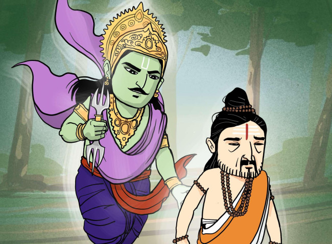 ในเช้าวันต่อมาหลังจากค่ำคืนฝันประหลาดของราธียะ พระอินทร์ผู้เป็นบิดาของอรชุนได้จำแลงกายเป็นพราหมณ์เฒ่า ออกเดินทางเข้าเมืองด้วยความตั้งใจที่จะไปพบราธียะตอนเวลาเที่ยงวัน ซึ่งเป็นเวลาที่ราธียะบูชาสุริยเทพเสร็จสิ้น และเปิดโอกาสให้ผู้คนเดินทางเข้าขอบริจาคสิ่งต่างๆ จากตน