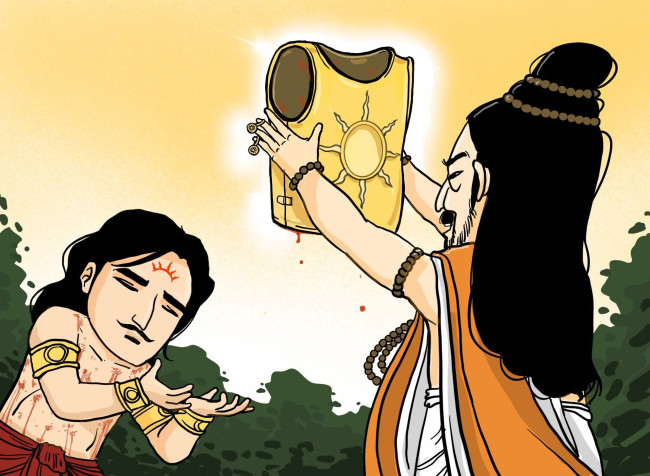 ราธียะรู้ได้ทันทีว่าตัวจริงของพราหมณ์คนนี้คือพระอินทร์ จึงหัวเราะออกมาและบอกกับพราหมณ์ว่าตนทราบแล้วว่าตัวตนที่แท้จริงของท่าน คือพระอินทร์ ตั้งใจจะมาขอของวิเศษที่ป้องกันตัวของตน เพื่อให้อรชุนได้เปรียบในสงครามที่จะมาถึง