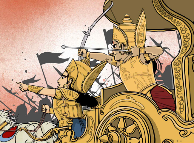 ทางด้านกองทัพหัสตินาปุระ ท้าวภีษมะและโทรณาจารย์ต่างก็มองเห็นเรื่องราวความสับสนวุ่นวายของกองทัพแคว้นมัสยะที่ตั้งทัพประจันหน้ากับตนอยู่ตั้งแต่ต้น โทรณาจารย์เพ่งมองดูสารถีผู้แต่งกายแปลกประหลาดอย่างถี่ถ้วนแล้วเอ่ยด้วยความมั่นใจว่า สารถีคนนั้นคืออรชุนอย่างแน่นอน แม่ทัพคนอื่นๆ ได้ยินก็รู้สึกตกใจที่ได้พบเจออรชุนในสนามรบแห่งนี้อย่างไม่คาดฝัน