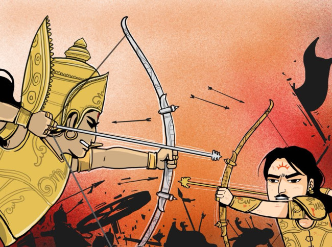 เมื่อคู่แค้นมาพบกันในสมรภูมิแห่งนี้ การประลองที่รุนแรงก็เกิดขึ้น อรชุนและกรรณะต่างใช้อาวุธยิงใส่กันอย่างไม่ยั้งมือ ต่างฝ่ายต่างมุ่งหวังจะสังหารฝั่งตรงข้ามเสียให้ได้ในวันนี้ ส่งผลให้กองทัพที่ติดตามทั้งกรรณะและอรชุนโดนอาวุธบาดเจ็บล้มตายไปเป็นจำนวนมาก
