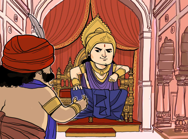 วันรุ่งขึ้น พี่น้องปาณฑพทั้งห้า รวมถึงพระนางเทราปทีก็แต่งตัวด้วยเครื่องทรงอย่างกษัตริย์ เดินทางเข้าราชสำนัก ยุธิษเฐียรผู้สลัดคราบของกังกะออกแล้ว ก็นั่งลงบนบัลลังก์ของท้าววิราฏอย่างสง่างาม