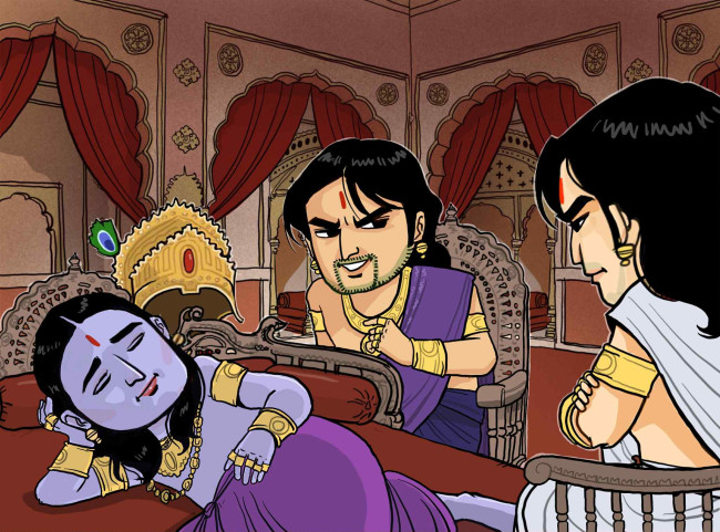 ทั้งสองเดินทางเข้าเมืองทวารกาและพบกับสาตยกี ที่บอกให้ทั้งสองทราบว่ากฤษณะกำลังหลับอยู่ ทั้งสองจึงเดินเข้าไปรอที่ห้องนอนของกฤษณะ แต่เนื่องจากทุรโยธน์มาก่อนจึงได้สิทธิ์นั่งอยู่ที่นั่งของแขกซึ่งอยู่ชิดด้านหัวของกฏษณะ ส่วนอรชุนผู้มาทีหลังจึงทำได้เพียงรออย่างสงบที่ปลายเท้าของกฤษณะ