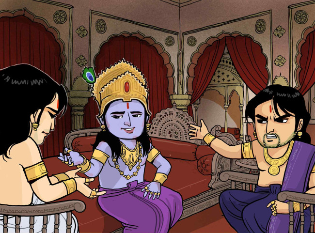 หลังจากที่กฤษณะได้รับรู้ถึงสาเหตุที่ทั้งอรชุนและทุรโยธน์เดินทางมาเข้าพบตน เพื่อขอเชื้อเชิญเข้าร่วมเป็นพันธมิตรของฝ่ายตนเอง กฤษณะรู้สึกลำบากใจ เพราะทั้งสองต่างเป็นเสมือนญาติพี่น้องด้วยกันทั้งสิ้น