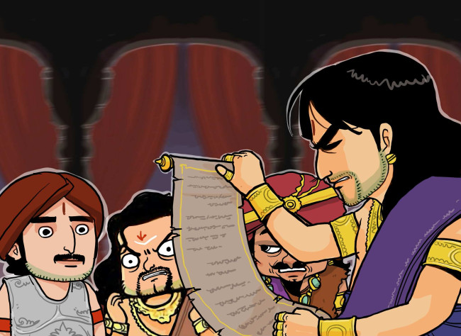 กรรณะไม่เห็นความจำเป็นที่จะต้องแบ่งทรัพย์สมบัติแม้แต่เพียงเล็กน้อยให้กับพี่น้องปาณฑพ คำพูดของกรรณะสร้างความพึงพอใจให้ให้กับทุกคนในที่ประชุมโดยเฉพาะทุรโยธน์