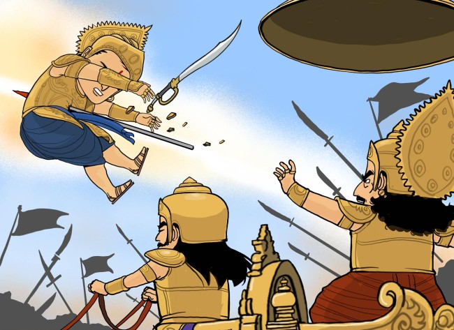 การต่อสู้ล่วงเลยไปจนตะวันบ่ายคล้อย ท่ามกลางกองกำลังที่เข้ามาสนับสนุนอภิมันยุ มีเจ้าชายอัตราซึ่งเป็นโอรสของท้าววิราฏ คนเดียวกันกับที่อรชุนเคยปลอมตัวไปเป็นสารถีร่วมรบด้วยกัน