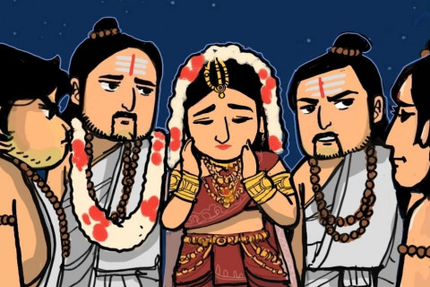 ในที่สุด วันที่จัดพิธีแต่งงานก็มาถึง ท้าวทรุปัทซึ่งได้พูดคุยกับลูกชายจนมั่นใจว่าแท้ที่จริงพราหมณ์ทั้งห้านี่คือภารดาปาณฑพอย่างแน่นอน จึงจัดพิธีแต่งงานให้อย่างยิ่งใหญ่สมเกียรติของพี่น้องปาณฑพ ในเบื้องต้นก่อนจะเริ่มพิธี ท้าวทรุปัทเอ่ยปากถามยุธิษเฐียร...