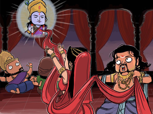 พระกฤษณะถึงแม้ว่าทรงติดพันระหว่างการทำสงครามที่เมืองทวารกา ก็ทรงทราบด้วยนิมิตรว่าพระนางเทราปทีกำลังตกอยู่ในสภาวะคับขัน ต้องการความช่วยเหลือจากพระองค์ ทันใดนั้นเองพระกฤษณะได้ประทานให้ผ้านุ่งของพระนางเทราปที ที่ถูกทุหสาสันกระชากออกจากร่างนั้น ออกมาได้ยืดยาวไม่มีที่สิ้นสุด และจะยังคงปกปิดร่างของพระนางเทราปทีอยู่เช่นเดิม
