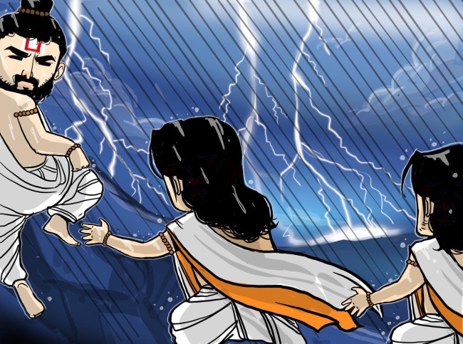 ระหว่างการเดินทางเป็นไปด้วยความยากลำบาก เนื่องจากอยู่ๆ ก็เกิดฟ้าฝนมืดครึ้ม มีฝนตกอย่างรุนแรง จนน้ำฝนท่วมล้นทางเดินไปหมด นอกจากนั้นยังมีฟ้าผ่า และลมพายุ จนคณะเดินทางต้องตัดสินใจหยุดพักการเดินทาง ให้ฝนหยุดตกเสียก่อน โดยมีภีมะซึ่งมีกำลังแข็งแกร่งกว่าใครเป็นผู้ดูแลความปลอดภัยของทุกคน