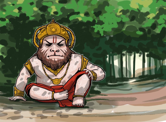 ในพื้นที่แห่งนี้เอง มีลิงยักษ์นอนหลับอยู่ ลิงยักษ์นั่นคือหนุมาน ทหารเอกของพระราม มานอนพักอยู่ใต้ร่มไม้ และถูกปลุกขึ้นมาด้วยเสียงสังข์ของภีมะ หนุมานทราบได้ทันทีว่าผู้ที่เป่าสังข์คือภีมะ ซึ่งถ้านับญาติกันแล้ว ภีมะก็เปรียบเหมือนน้องชายของตน เนื่องจากเป็นบุตรของวายุเทพเช่นเดียวกัน