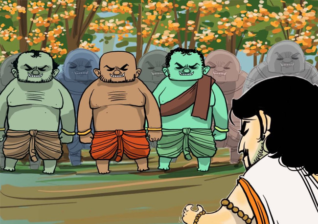 ภีมะบอกความต้องการให้รากษสทั้งหลายรับทราบ แต่รากษสทั้งหลายเกิดไม่พอใจ จึงทำท่าทางดุดัน และไล่ให้ภีมะออกไปจากดินแดนแห่งนี้เสีย ไม่เช่นนั้นก็จะใช้กำลังเข้าทำร้ายภีมะ ส่งผลให้สถานการณ์เริ่มตึงเครียดขึ้น