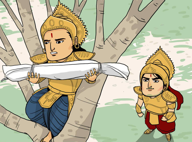 จุดมุ่งหมายแรกของอรชุนคือต้นไม้ที่เหล่าพี่น้องปาณฑพได้แอบซ่อนอาวุธประจำกายของอรชุน นั่นคือธนูคาณฑีวะ และสังข์เทวทัต เพื่อใช้ในการประกาศให้กองทัพทั้งหลายทราบว่า อรชุนได้กลับมาสู่สงครามแล้ว
